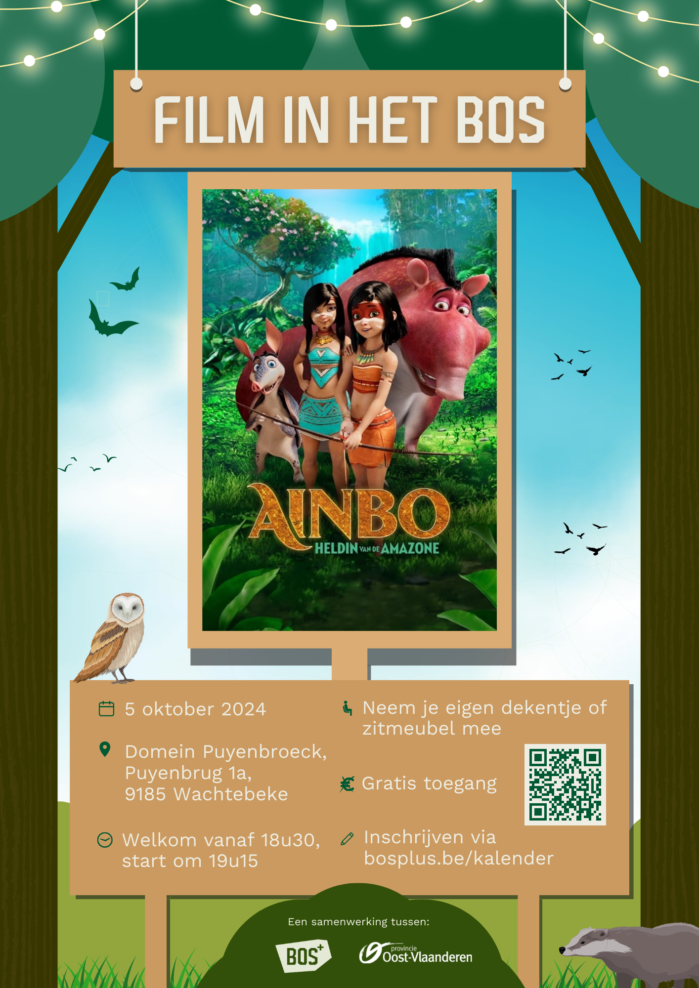 'Film in het Bos' kan je aanvragen bij Bos+ voor 1500 euro waarbij alle kosten inbegrepen zijn voor de vertoning en begeleiding door 2 vrijwilligers van Bos+.