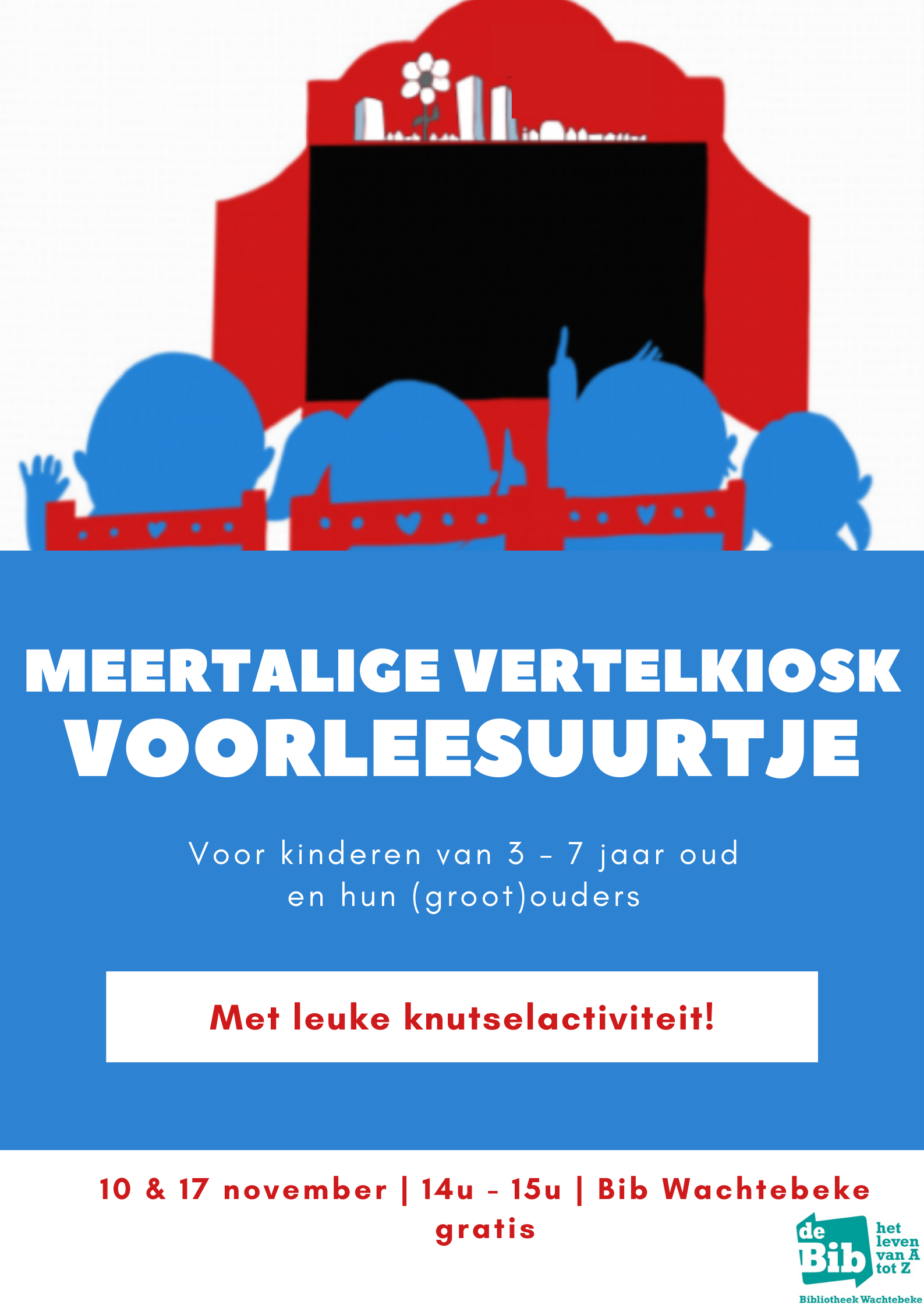 De Bib van Wachtebeke organiseerde in het kader van de voorleesweek op 10 en 17 november 2021 een voorleesuurtje in het gezelschap van de meertalige Kamishibai vertelkiosk, met daaraan gekoppeld een knutselactiviteit. De vertelkiosk is opgevat als een moderne versie van de rondreizende kamishibai uit de Japanse traditie en kan telkens op andere plekken geïnstalleerd worden om kinderen met voorlezen en boeken in contact te brengen. De mobiele vertelkiosk is uitgerust met een touchscreen waarop filmpjes vertoond worden met voorlezers die in hun moedertaal voorlezen. Daarnaast is er een boekenkast met boeken zonder woorden in de kiosk geïntegreerd om zo ook het fysieke contact met het boek te behouden. Op de digitale vertelkiosk zijn er 99 verhalen te zien en dit in 21 verschillende talen. Aan sommige verhalen is er ook een verwerkingsactiviteit gekoppeld: een aantal verwerkingsvragen over het verhaal, een activiteit rond talensensibilisering (zoals een liedje of leren tellen tot tien in een taal) of een knutselactiviteit. De verhalen zijn geschikt voor kinderen tussen drie en tien jaar, maar hun (groot-) ouders kunnen er ook van genieten. De vertelkiosk is gratis te ontlenen bij het documentatiecentrum Mondiale Solidariteit.