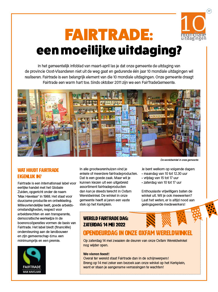 Het 2-maandelijks Infoblad van Sint-Gillis-Waas zorgde in 2022 voor een artikel rond mondiale solidariteit in elk infoblad. In Jan-Febr. werd het burgerinitiatief Wegwijzer Mama Kongolese in de kijker gezet. In Maart-April informeerde de gemeente zijn inwoners over de 10 mondiale uitdagingen van de Provincie Oost-Vlaanderen die het was aangegaan. Het Mei-Juni nummer bracht een artikel uit over ‘Fair Trade: een moeilijke uitdaging?’. In Juli-Augustus werd info gegeven over het sociaal project in Portugal dat de gemeente steunt. In Sept.-Okt. kon het Sint-Egidiusfonds zijn werking voorstellen. In het Nov.-Dec. nummer was het tijd voor een stand van zaken van de 10 mondiale uitdagingen. En in Jan-Febr. 2023 werd de werking van de Dorizon Doenja vzw rond nieuwe onderwijskansen in Tanzania belicht. De Mondiale Solidariteitsraad werkte in 2022 ook een mooie brochure uit over zijn werking en die van de verschillende lidorganisaties.