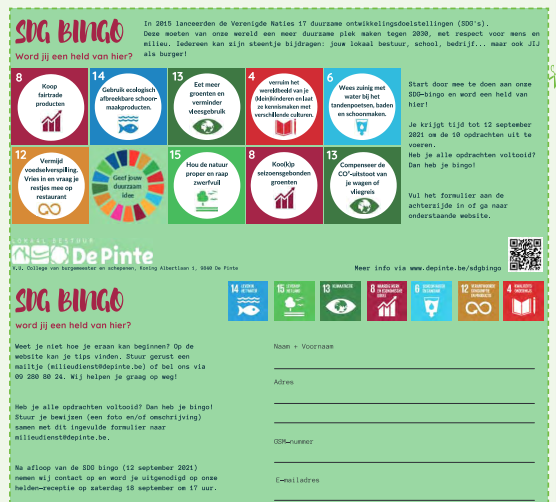 Inwoners van de Pinte kregen een maand de tijd om 10 opdrachten verbonden met verschillende duurzame ontwikkelingsdoelstellingen te volbrengen. De opdrachten staan vermeld in het Infoblad. Een aantal voorbeelden zijn: koop Fair Trade producten (SGD 8); wees zuinig met water bij het tandenpoetsen, baden en schoonmaken (SDG 6); verbreed het wereldbeeld van je (klein-)kinderen en laat ze kennis maken met andere culturen (SDG 4); geef jouw duurzaam idee;… Na het volbrengen van de opdrachten, kan de lezer die bewijzen met een omschrijving of foto via het daartoe voorziene formulier. Als afsluiter, organiseert de gemeente een ‘heldenreceptie’.
