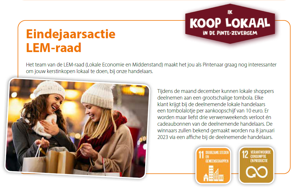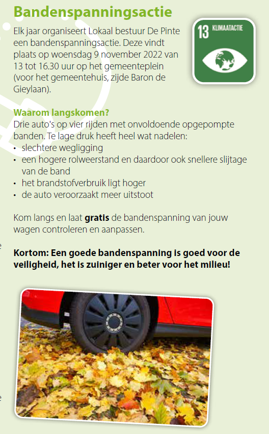De Pinte steunt de duurzame ontwikkelingsdoelstellingen. De lezer vindt in de Infokrant maart-april 2021 informatie over de duurzame ontwikkelingsdoelstellingen en het bericht dat er vanaf nu bij verschillende artikels een SDG-logo zal staan om duidelijk te maken met welke acties de gemeente bijdraagt aan de internationale doelen. De betrokken doelstelling wordt dus via een blokje in de kijker gezet. Ook in latere nummers wordt de lezer met volgend tekstje geïnformeerd: ‘De Pinte steunt de duurzame ontwikkelingsdoelstellingen. Een verwijzing vind je bij verschillende artikels door de betrokken doelstelling via een blokje in de kijker te zetten’.