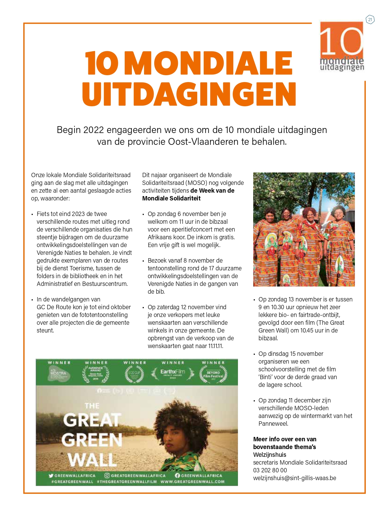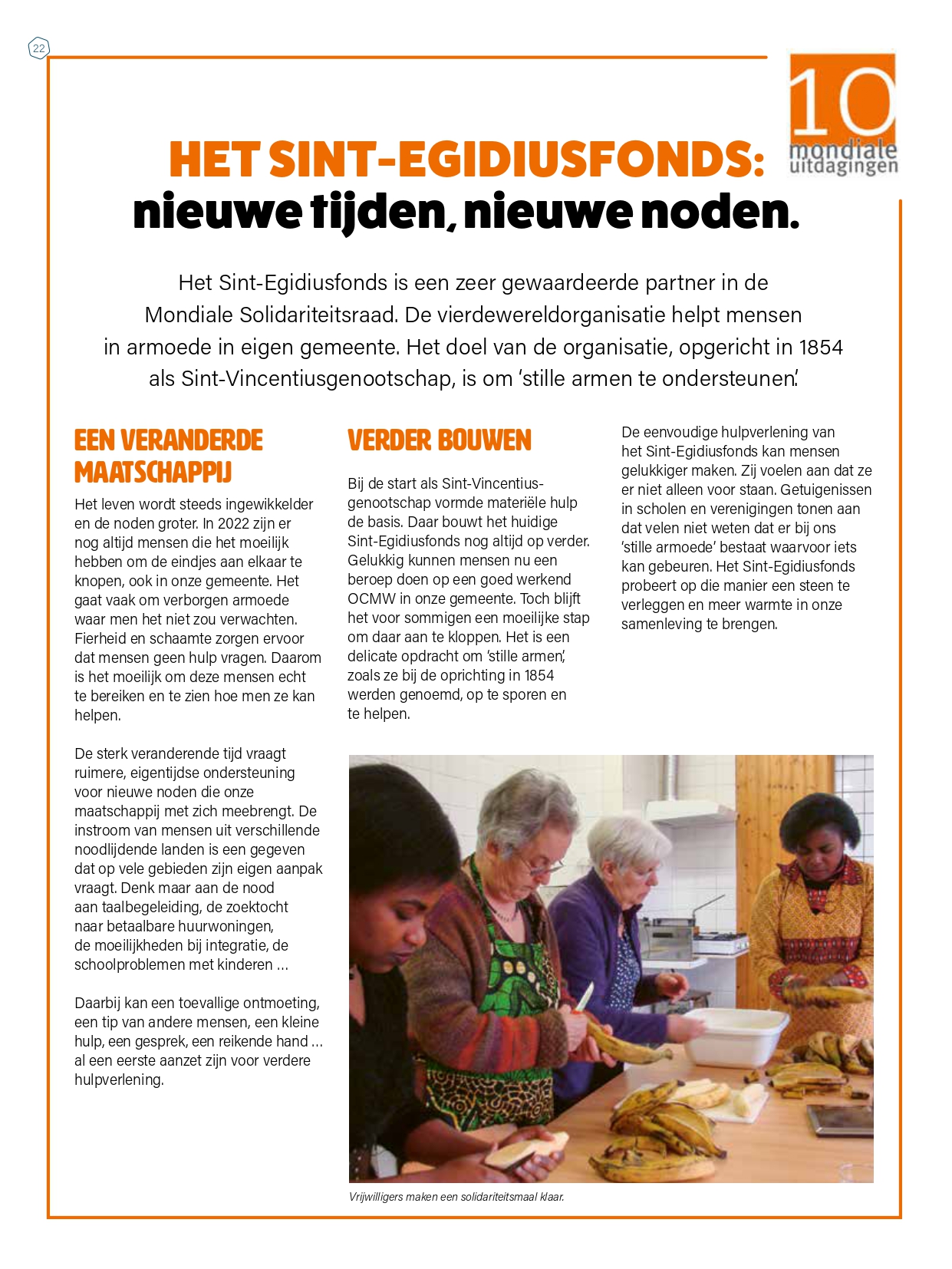 Het 2-maandelijks Infoblad van Sint-Gillis-Waas zorgde in 2022 voor een artikel rond mondiale solidariteit in elk infoblad. In Jan-Febr. werd het burgerinitiatief Wegwijzer Mama Kongolese in de kijker gezet. In Maart-April informeerde de gemeente zijn inwoners over de 10 mondiale uitdagingen van de Provincie Oost-Vlaanderen die het was aangegaan. Het Mei-Juni nummer bracht een artikel uit over ‘Fair Trade: een moeilijke uitdaging?’. In Juli-Augustus werd info gegeven over het sociaal project in Portugal dat de gemeente steunt. In Sept.-Okt. kon het Sint-Egidiusfonds zijn werking voorstellen. In het Nov.-Dec. nummer was het tijd voor een stand van zaken van de 10 mondiale uitdagingen. En in Jan-Febr. 2023 werd de werking van de Dorizon Doenja vzw rond nieuwe onderwijskansen in Tanzania belicht. De Mondiale Solidariteitsraad werkte in 2022 ook een mooie brochure uit over zijn werking en die van de verschillende lidorganisaties.